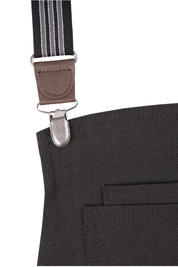Stilrent serveringsförkläde i svart tyg med grå hängslen från Chef Works. Berkeley BiB förkläde har en praktisk bröstficka med plats för penna och anteckningsblock, samt sidofickor för exempelvis kapsylöppnare och annat som kan behövas. Hängslena fästs på bak- och framsidan och är i en matchande grå färg. Smakfullt och modernt förkläde för alla tillfällen.