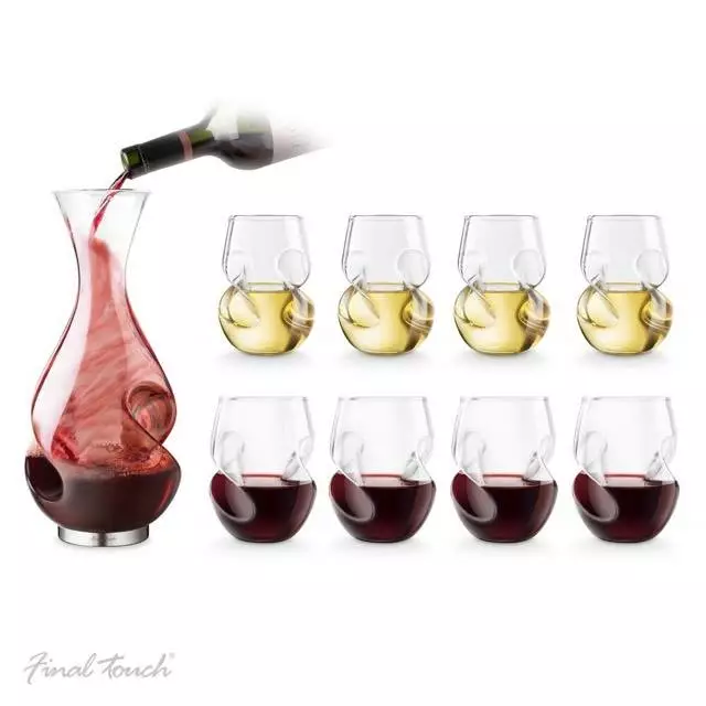 En läcker karaff som speciellt utformats för att lufta viner vid dekantering. Conundrum Vinluftningskaraff från brittiska Final Touch har en unik konstruktion som i två steg syresätter vinet och öppnar upp dess smak och arom. Karaffen i sig är läckert skruvad och levereras med 4 st rödvinsglas och 4 st vitvinsglas. Glasen har även de försetts med den elegant skruvade formen som karaffen har och är riktigt vackra tillsammans.