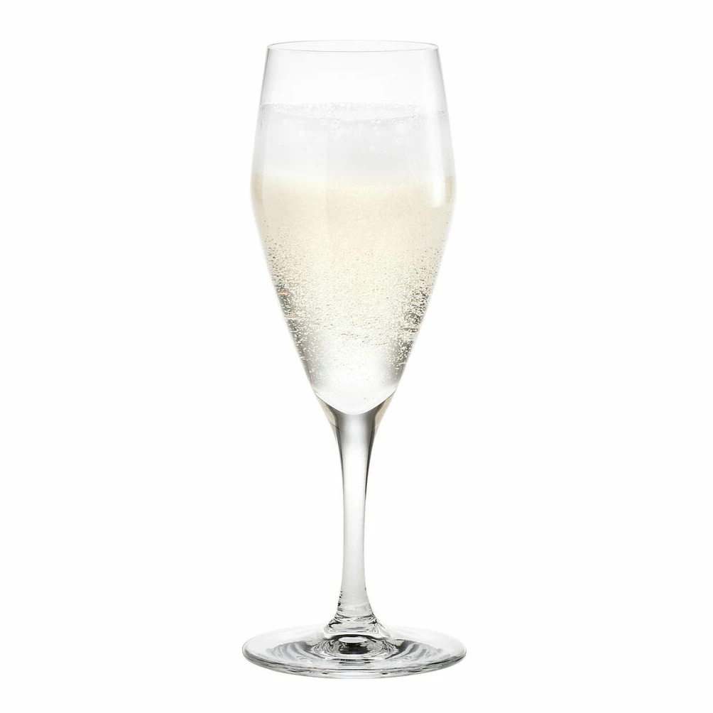 Ett nätt, matchande champagneglas. Perfection Champagne har den för serien karraktäristiska formen på kupan, men kroppen är smal och lång för att bevara kolsyran i drycken. Ett mycket elegant litet glas för mousserande viner som Champagne, Crémant, Prosseco och Cava.