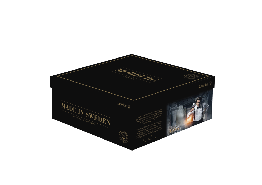 ”…Att se glasen växa fram ur glasblåsarens mun. Det är som att se en organism som plötsligt fryser”. Sedan han var liten har skådespelaren och matprofilen Per Morberg fascinerats av hantverket bakom att framställa kristallglas; glasblåsning. I ett samarbete med svenska Orrefors har Morberg nu fått möjligheten att tillsammans med Orrefors utforma sin alldeles egna serie glas. Resultatet är kompromisslöst och elegant! Morberg Exclusive visar prov på både högkvalitativt hantverk och tidlös design, signerat Per Morberg.