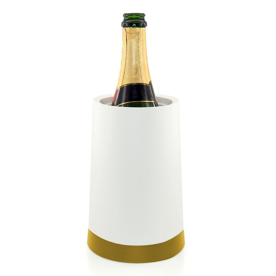 Vinkylare gel vit med guldig botten att kyla vin och andra flaskor som kan placeras i behållaren. Gelen placeras i kylen eller frysen beroende på kylan som önskas vid användandet.