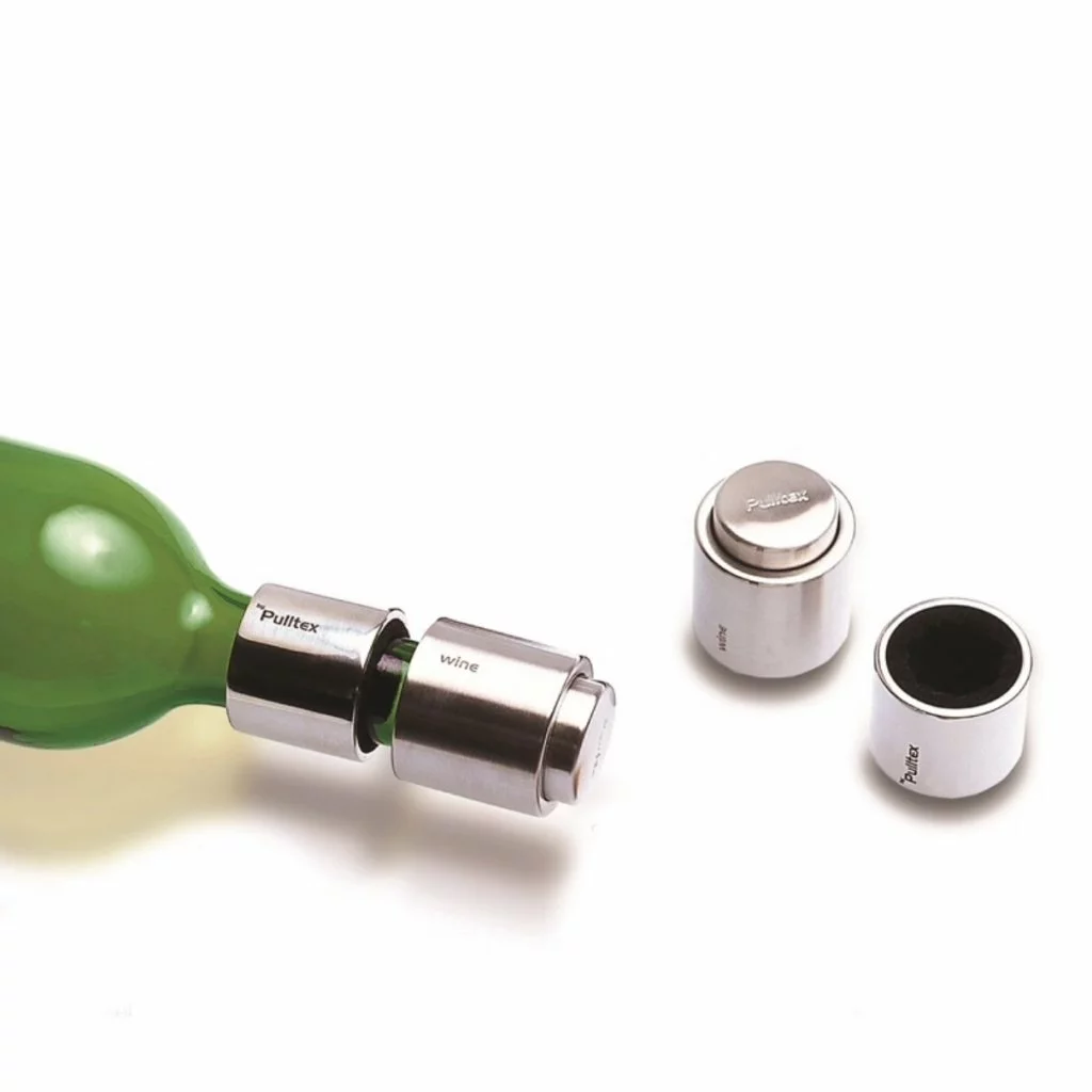 Pulltex Vinstopper med matchande droppkork är en stopper som förhindrar oavsiktligt öppnande genom ett säkerhetslock. Denna vinstopper är enkel att använda, servering görs efter ett knapptryck som gör att locket lossnar. Spill undviks genom den matchande droppkorken.