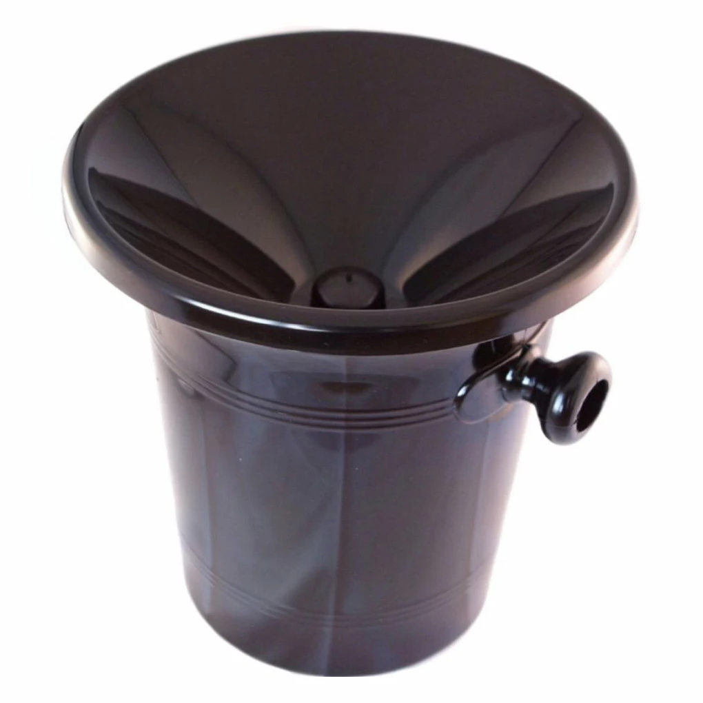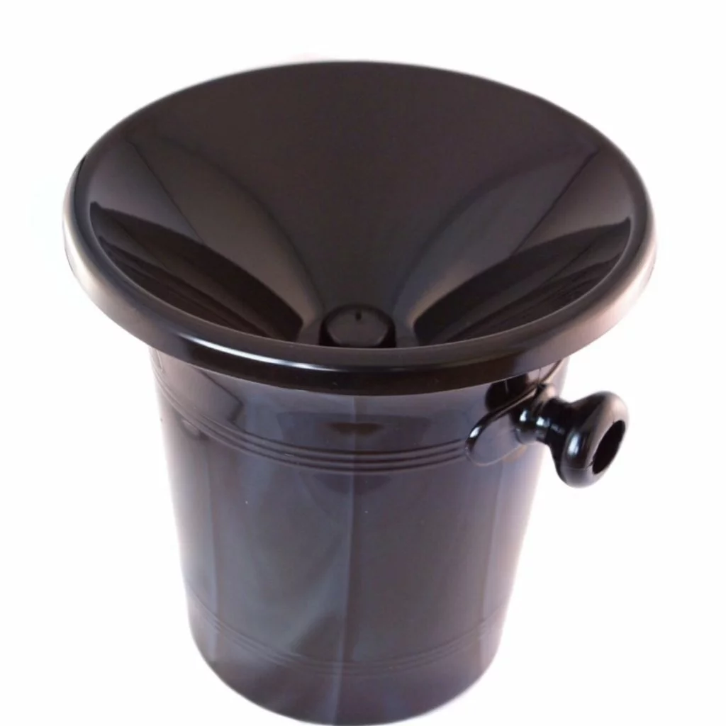 En rund spittoon i svart plast. Perfekt spottkopp att ha till vinprovning då det möjliggör en diskret väg att spotta ut vinet efter provsmakning. Upptill är denna Spittoon försedd med ett större trattformat lock som bidrar till att undvika spill, samt döljer dess innehåll.